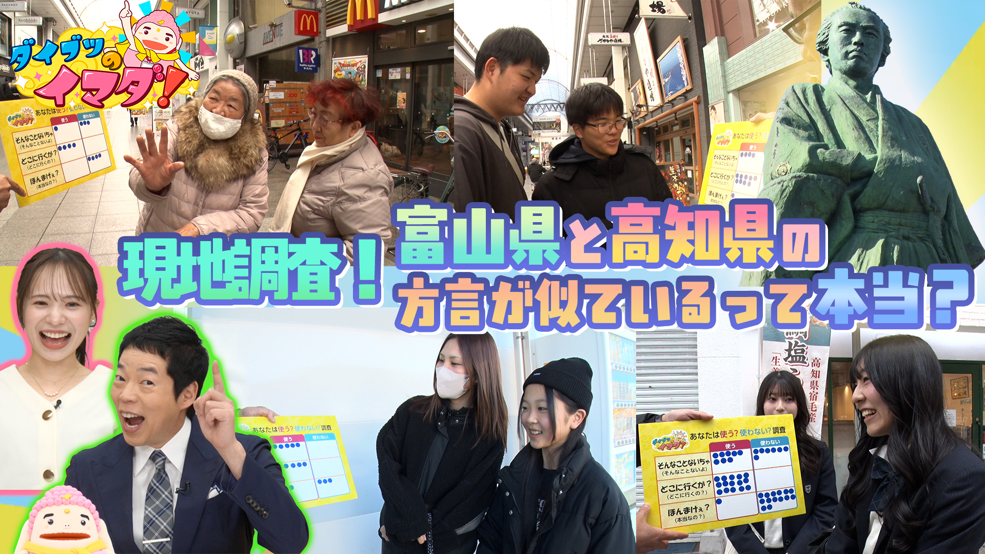 富山弁と似ている方言があるのか、街で聞きこむと高知県の言葉を挙げる人が多い結果となる。そこで番組スタッフは高知県に向かい、代表的な富山弁を高知県民が使うのか街頭インタビューを敢行!さらに、高知の方言に詳しい方に伺うと、富山県と高知県の方言に多くの共通点があることが判明!その理由が、「あの場所」からの距離であることが明らかになる!また、富山の伝統産業・高岡銅器を盛り上げるために新プロジェクトを始動する。